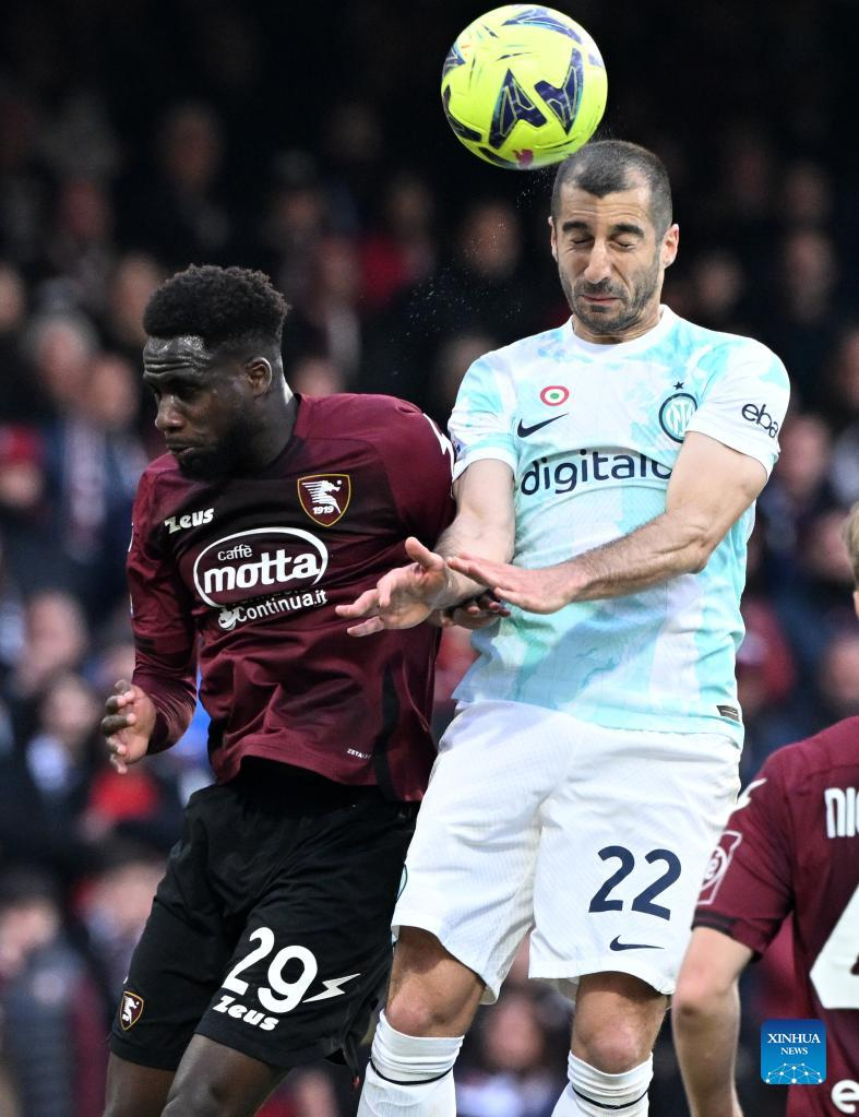 FC Inter's Henrikh Mkhitaryan (R) vies with Salernitana's Boulaye Dia during a Serie A football match between FC Inter and Salernitana in Salerno, Italy, on April 7, 2023. (Str/Xinhua)