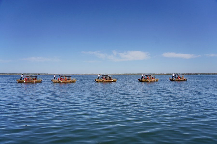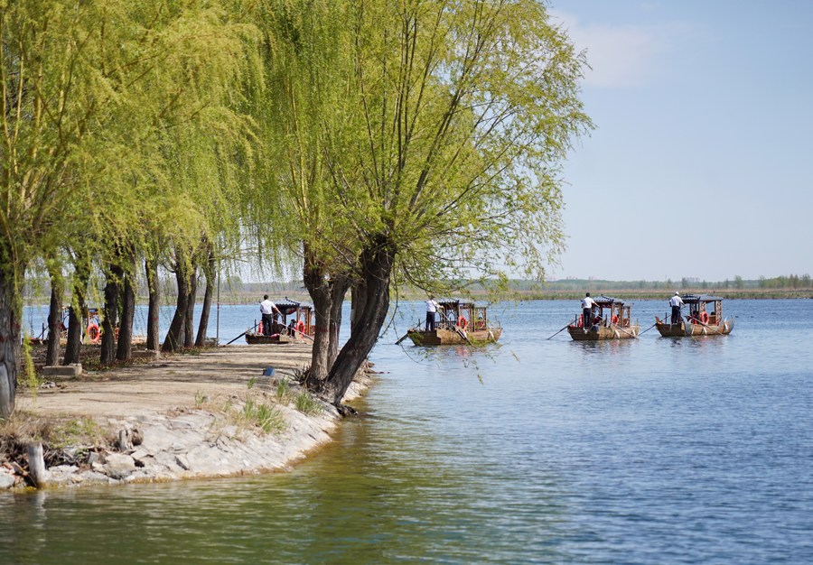 XIONG'AN, April 8, 2023 (Xinhua) -- The Baiyangdian Lake water bus service is currently in trial operation and will soon be officially launched. The service features 100 vessels powered by liquefied petroleum gas (LPG), which are more cost-efficient and environmentally friendly than oil-fueled boats. Visitors can also take traditional wooden boats which offer an alternative way of touring the Baiyangdian Lake.