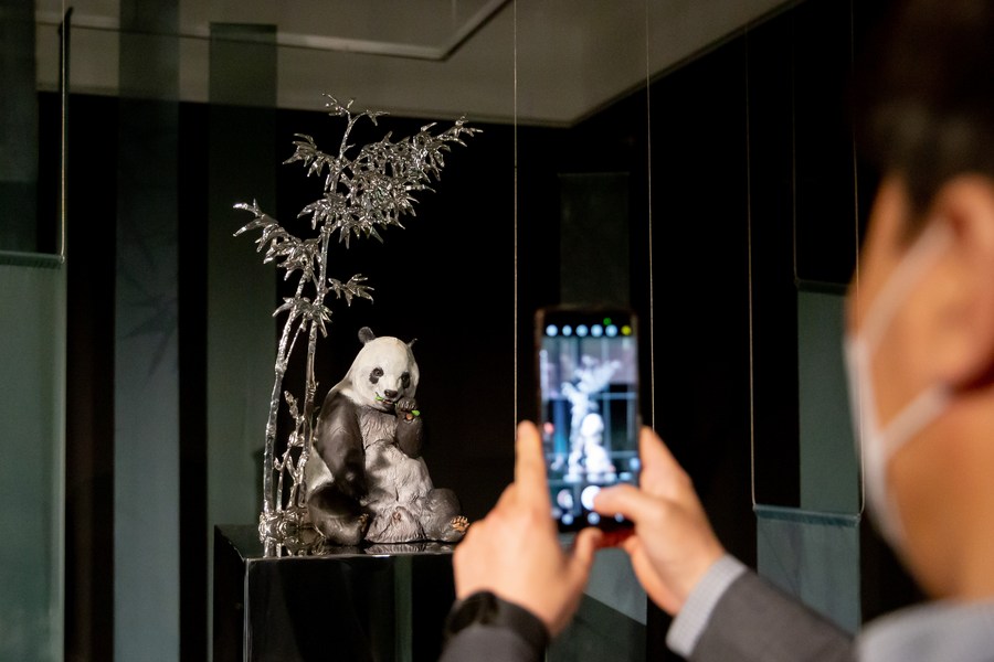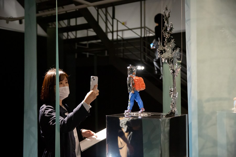 A visitor takes photo of a sculpture at the Chinese pavilion for the 14th Gwangju Biennale in Gwangju, South Korea on April 7, 2023. (Xinhua/Wang Yiliang)