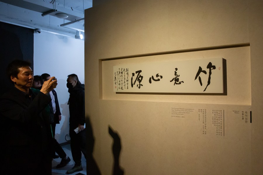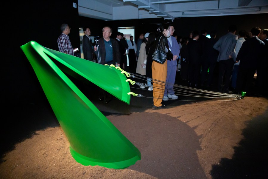 People visit the Chinese pavilion for the 14th Gwangju Biennale in Gwangju, South Korea on April 7, 2023. (Xinhua/Wang Yiliang)
