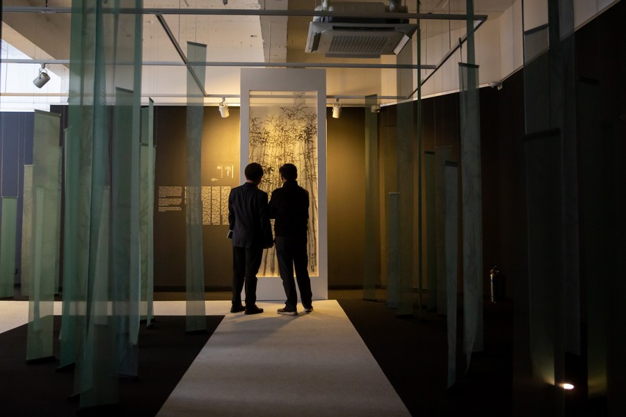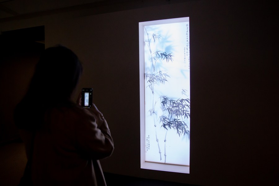 A visitor takes photo of an ink painting on silk at the Chinese pavilion for the 14th Gwangju Biennale in Gwangju, South Korea on April 7, 2023.(Xinhua/Wang Yiliang)
