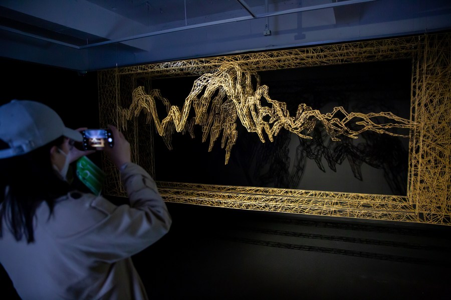 A visitor takes photo of an installation at the Chinese pavilion for the 14th Gwangju Biennale in Gwangju, South Korea on April 7, 2023. (Xinhua/Wang Yiliang)