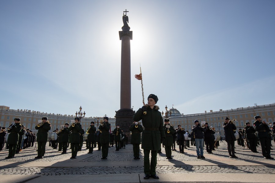 A rehearsal for this year's Victory Day military parade to mark the 78th anniversary of the Soviet Union's victory in the Great Patriotic War is held in St. Petersburg, Russia, April 7, 2023. (Photo by Irina Motina/Xinhua)
