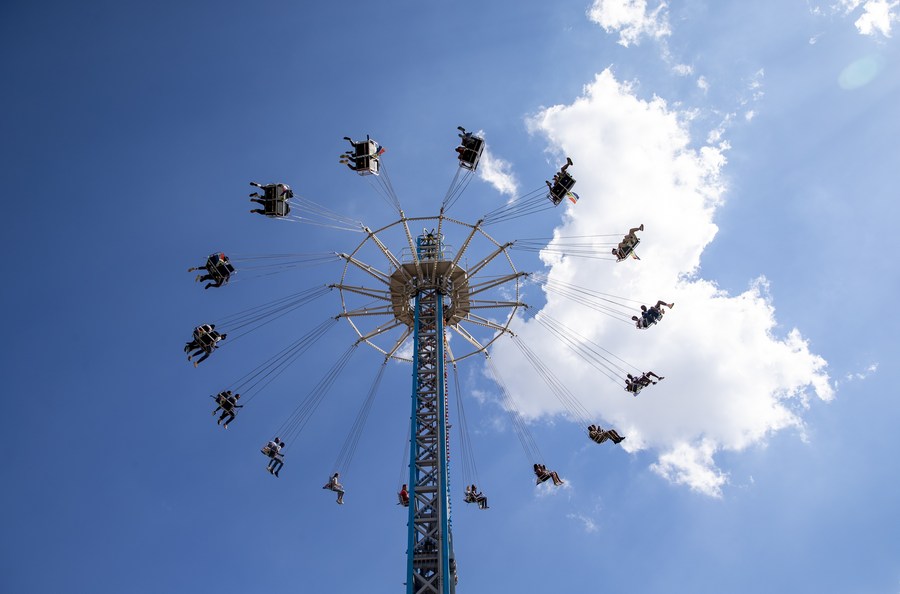Visitors take amusement rides during the Rand Show 2023 at the Johannesburg Expo Center in Johannesburg, South Africa, April 7, 2023. The Rand Show 2023, the annual entertainment and shopping extravaganza in South Africa, kicked off on Thursday at the Johannesburg Expo Center. (Xinhua/Zhang Yudong)