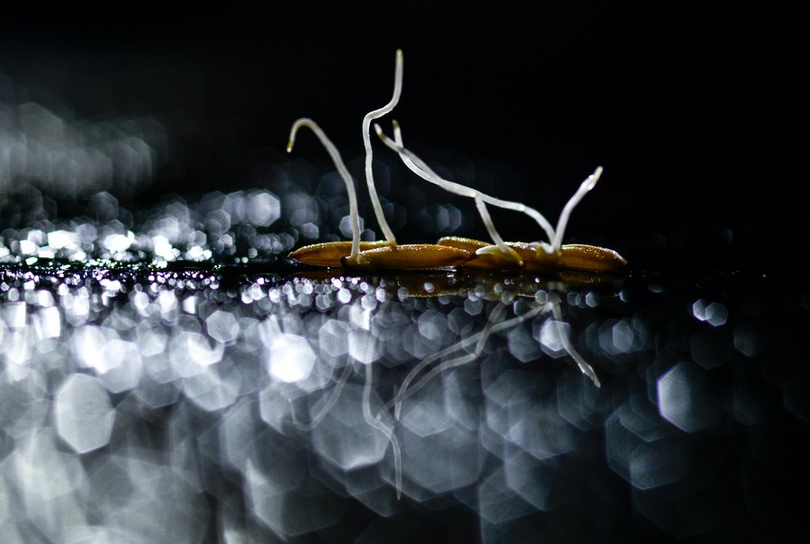 This photo taken on April 6, 2023 shows a germinating hybrid rice seed at a hybrid rice plantation household in Shuiwei Town of Cengong County, southwest China's Guizhou Province. Cengong, with 47 years of hybrid rice seed production history, is a national level rice seed production county in China. Each year Cengong could provide over eight million kilos of rice seeds to the market, which effectively helps local residents to increase their income. (Xinhua/Yang Wenbin)