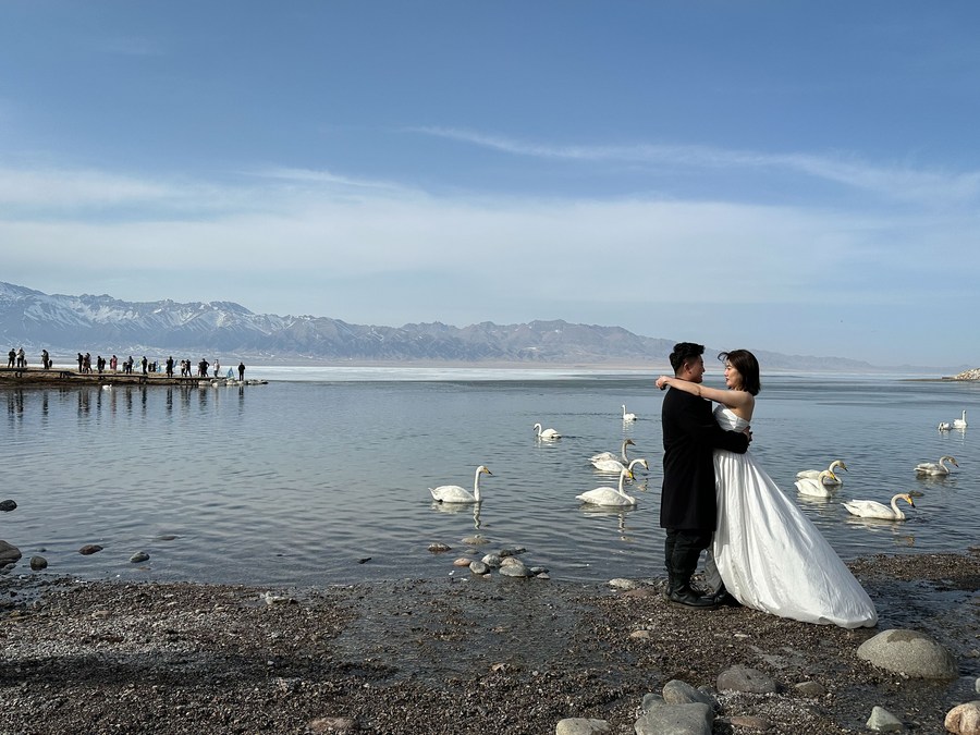 A couple pose for wedding photos on the shore of Sayram Lake in Bortala Mongolian Autonomous Prefecture, northwest China's Xinjiang Uygur Autonomous Region, April 6, 2023. The frozen Sayram Lake in Xinjiang has begun to thaw amid rising temperatures. Surrounded by grasslands and the Tianshan Mountains, the lake attracts lots of tourists every day. (Xinhua/Li Xiang)