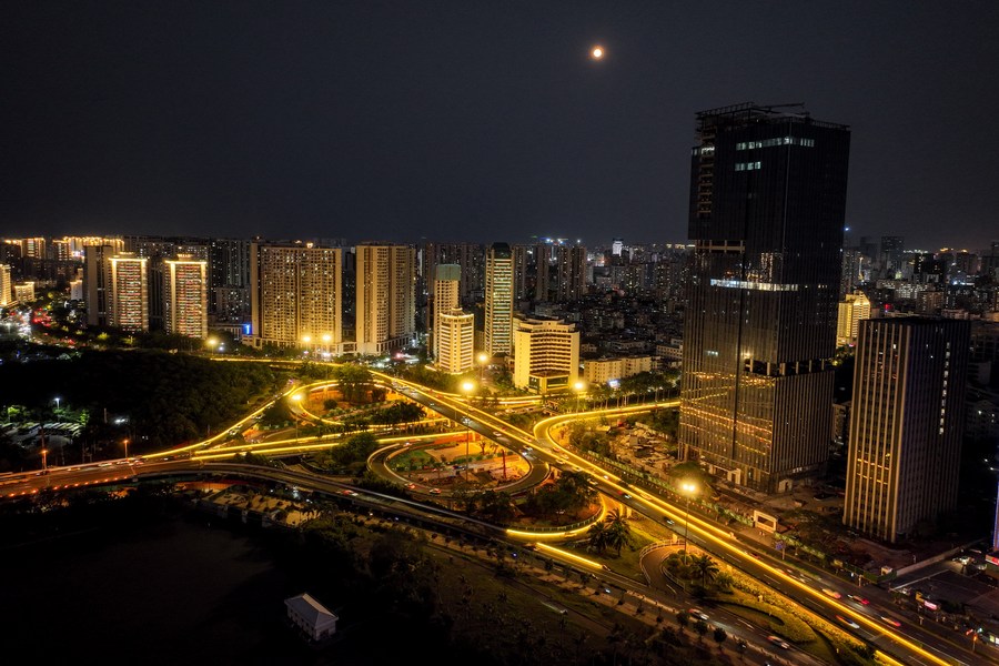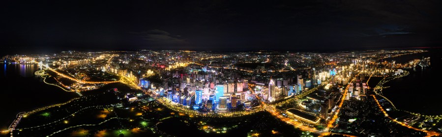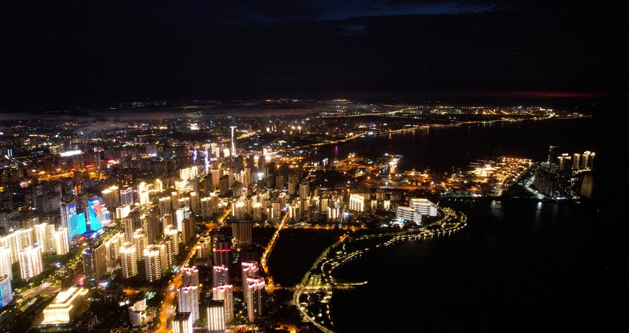 This aerial photo taken on Aug. 19, 2022 shows a night view of Haikou, south China's Hainan Province. (Xinhua/Yang Guanyu)
