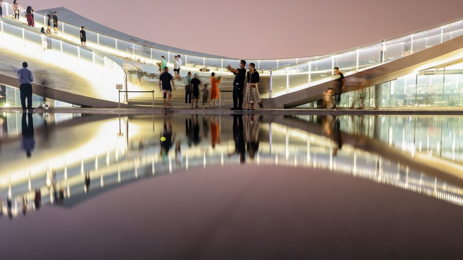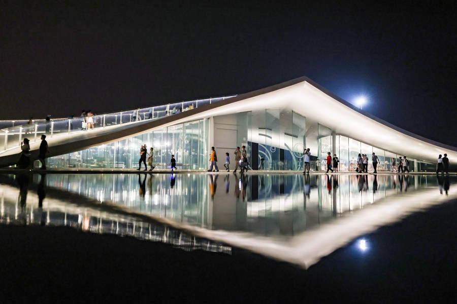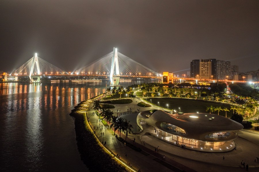 Tourist enjoy the night view at the Sky Mountain Haikou Bay Public Pavilions No. 6 Station in Haikou, south China's Hainan Province on April 6, 2023. (Xinhua/Zhang Liyun)
