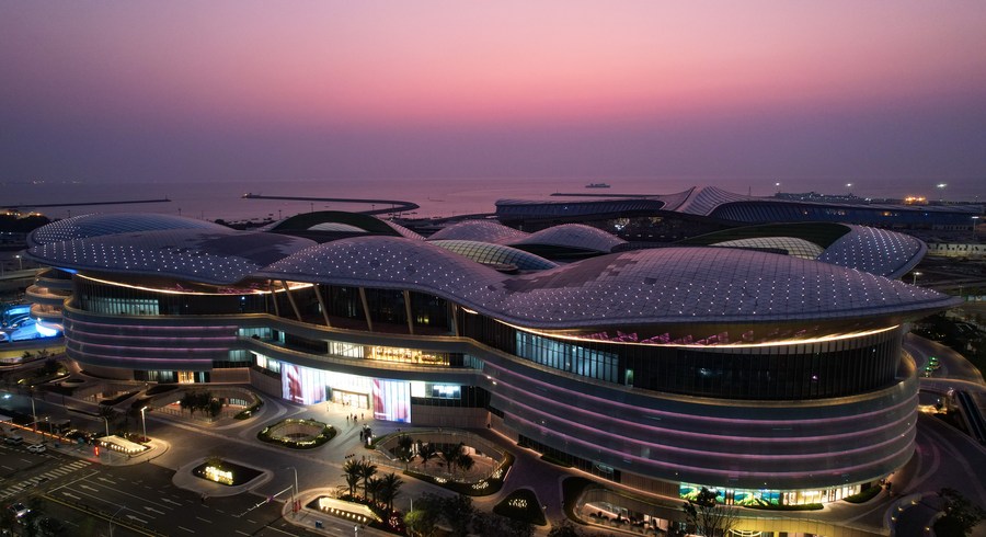 This aerial photo taken on April 6, 2023 shows a night view of the Hainan International Convention and Exhibition Center, the venue for the upcoming third China International Consumer Products Expo (CICPE), in Haikou, south China's Hainan Province. (Xinhua/Yang Guanyu)