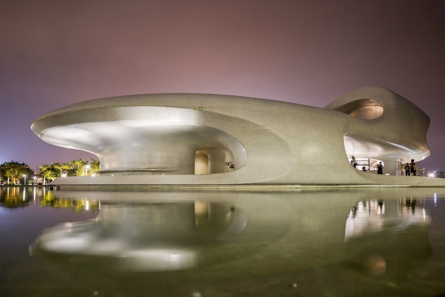 This photo taken on April 6, 2023 shows a night view of the Wormhole Library in the Haikou Bay, Haikou, south China's Hainan Province. (Xinhua/Zhang Liyun)