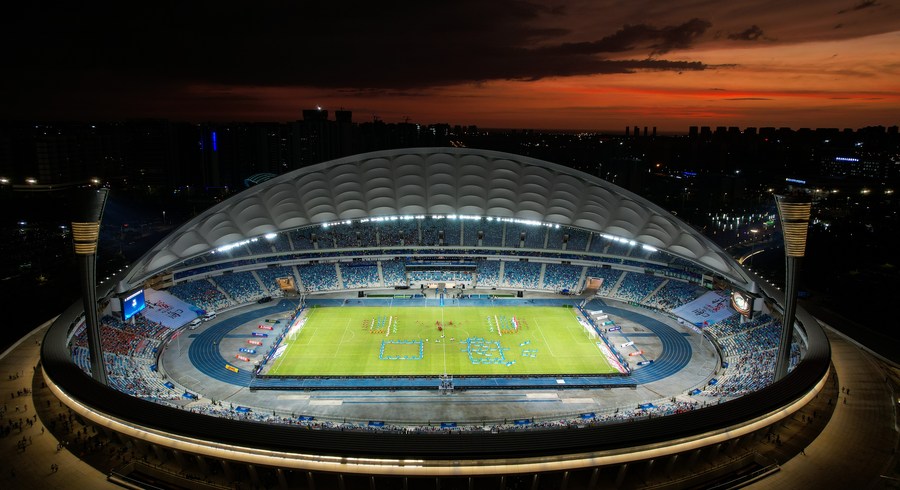 This aerial photo taken on June 3, 2022 shows the opening ceremony of 2022 season Chinese Football Association Super League (CSL) in Haikou, south China's Hainan Province. (Xinhua/Yang Guanyu)■