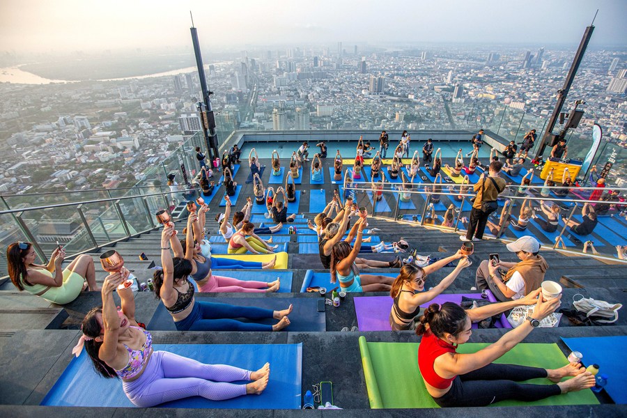 Yoga enthusiasts practice yoga at an observation deck on the rooftop of the King Power Mahanakhon building in Bangkok, Thailand on April 8, 2023. (Xinhua/Wang Teng)