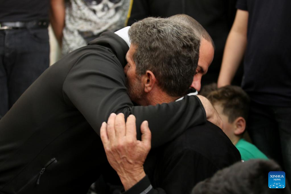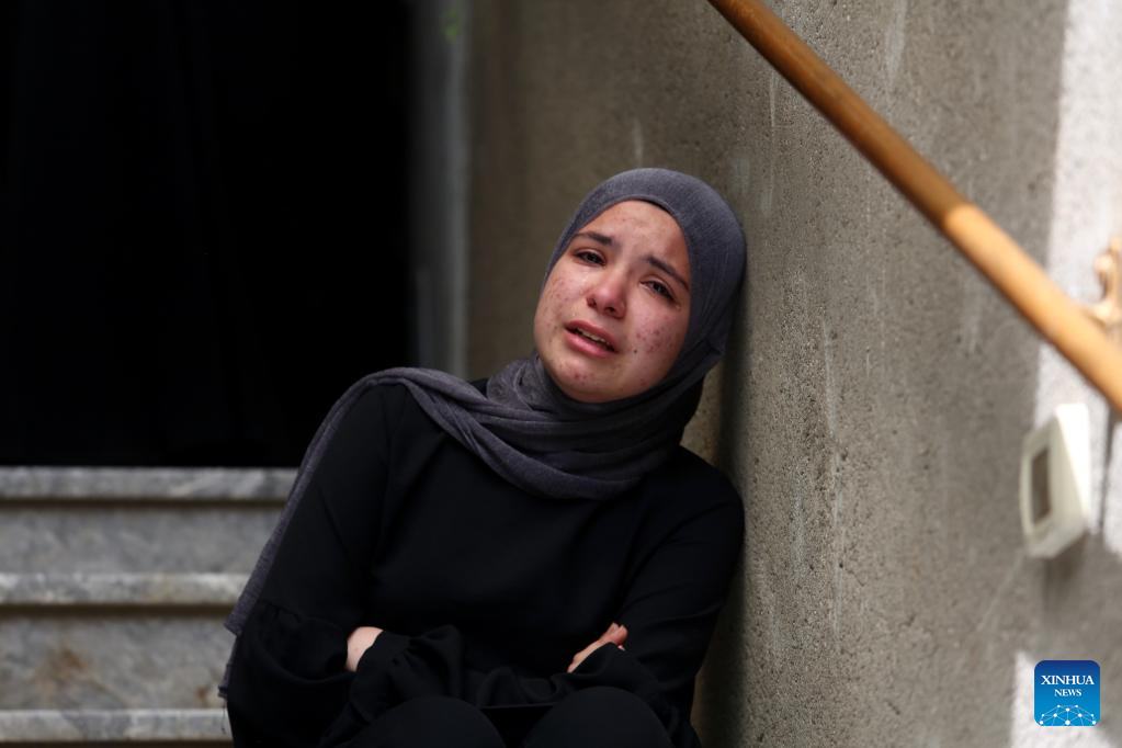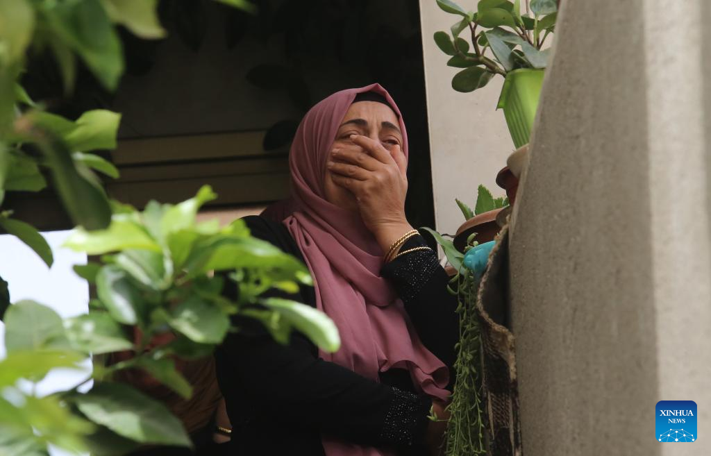 A relative mourns during the funeral of A'ahead Isleem in the village of Azzoun, east of the northern West Bank city of Qalqilya, on April 9, 2023. A Palestinian was killed on Saturday during clashes with Israeli soldiers in the village of Azzoun, east of the northern West Bank city of Qalqilya, Palestinian medics and eyewitnesses said. (Photo by Nidal Eshtayeh/Xinhua)