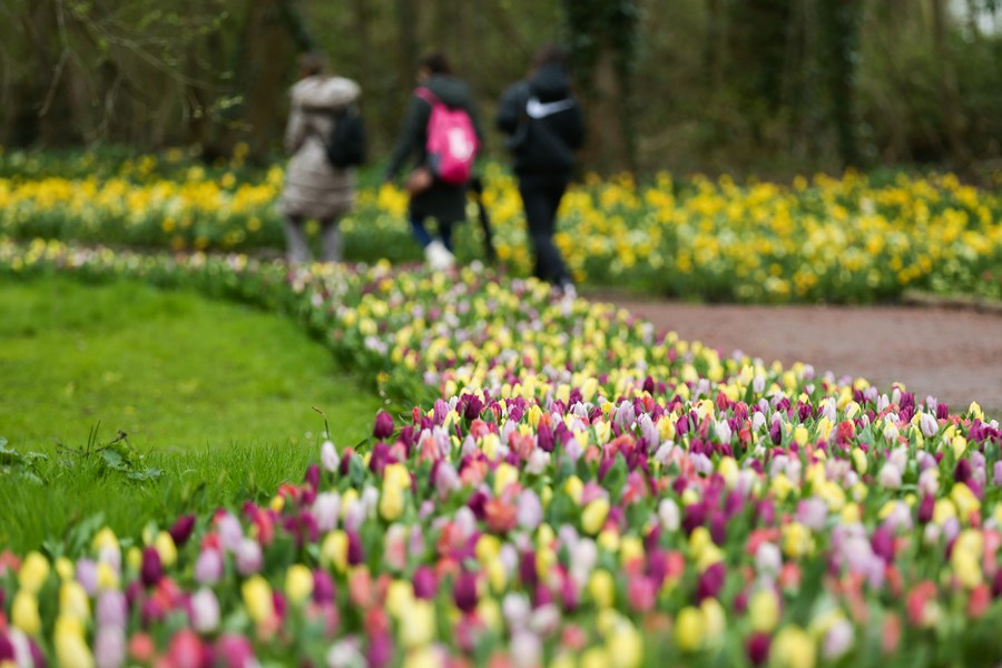 Visitors stroll through the flower path during the Floralia Brussels at Groot-Bijgaarden Castle in Dilbeek near Brussels, Belgium, April 7, 2023. (Xinhua/Zheng Huansong)