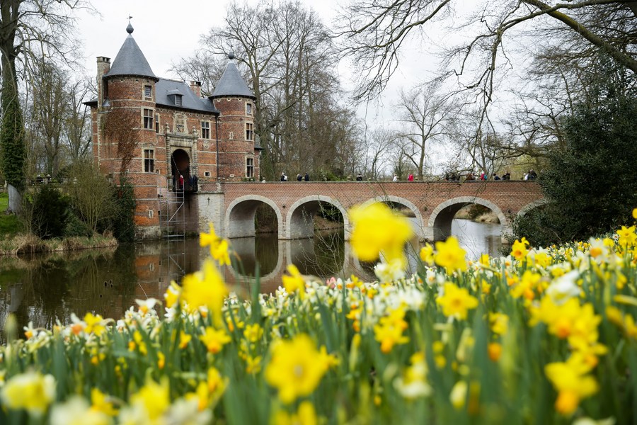 Visitors walk among flowers during the Floralia Brussels at Groot-Bijgaarden Castle in Dilbeek near Brussels, Belgium, April 7, 2023. (Xinhua/Zheng Huansong)
