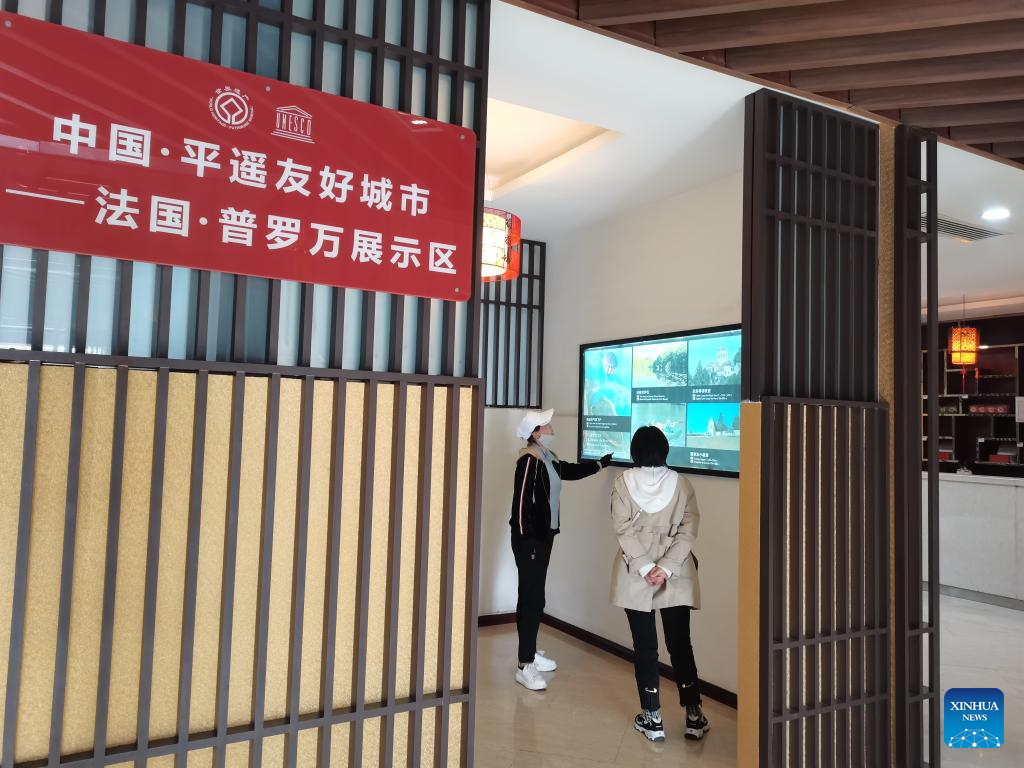 People visit an exhibition on Provins of France at the tourist center of Pingyao ancient county in north China's Shanxi Province, April 9, 2023. (Photo by Hou Liping/Xinhua)