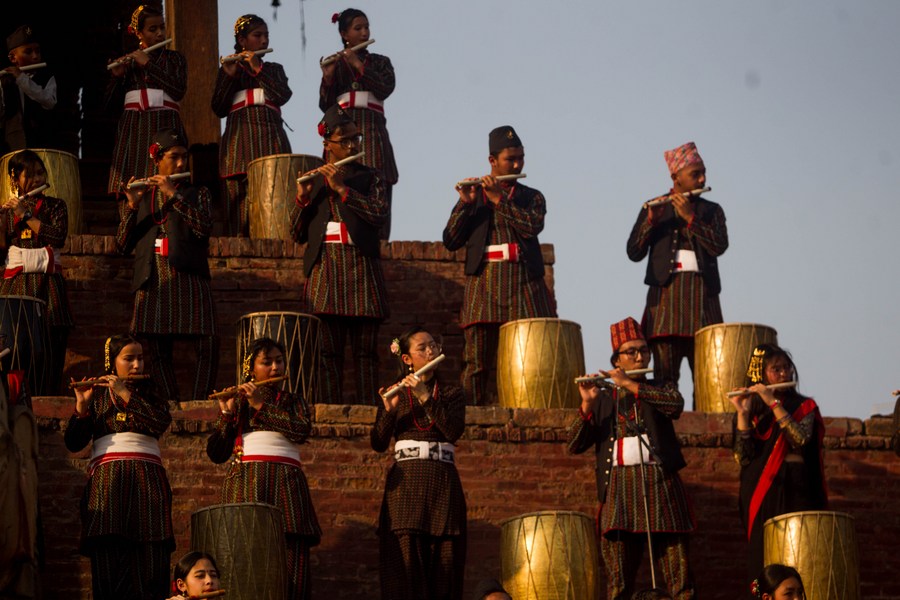 BHAKTAPUR, Nepal, April 10 (Xinhua) -- A musical event is held at the former royal palace complex Bhaktapur Durbar Square in Nepal's historic city-state Bhaktapur to mark the upcoming Nepali New Year.