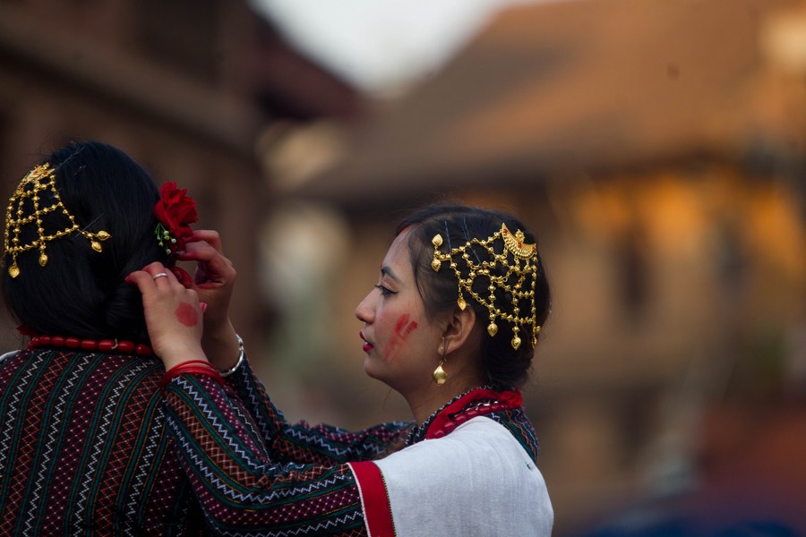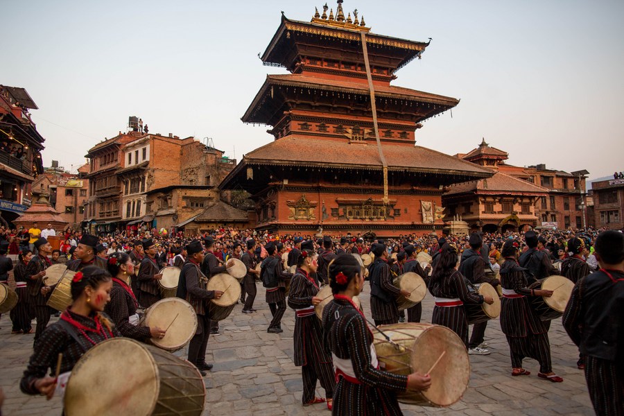 People in traditional attire take part in a musical event organized to mark the upcoming Nepali New Year at Bhaktapur Durbar Square in Bhaktapur, Nepal, April 9, 2023. (Photo by Sulav Shrestha/Xinhua)