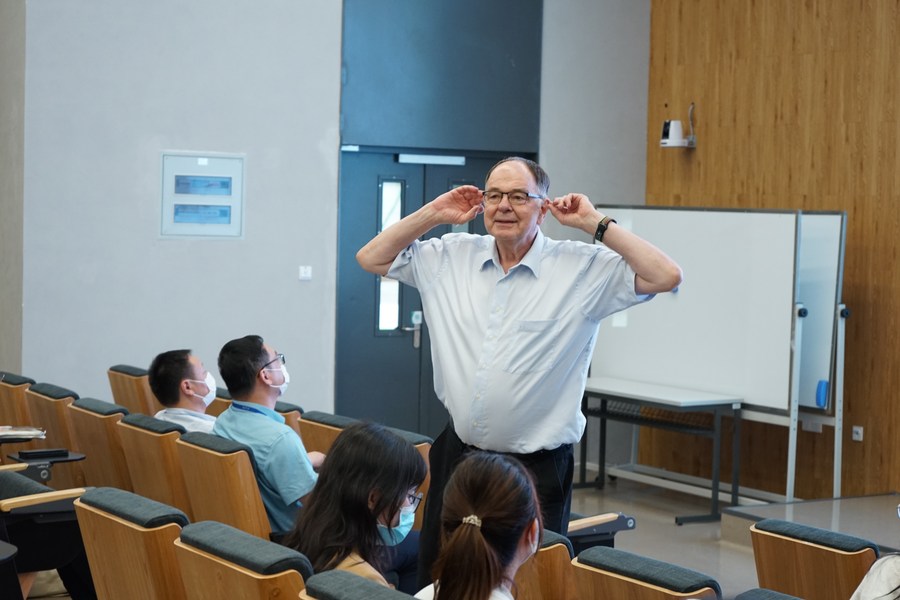 This undated photo shows Franz Raps teaching Chinese students at the College of Urban Transportation and Logistics at Shenzhen Technology University (SZTU) in Shenzhen, south China's Guangdong Province. (SZTU/Handout via Xinhua)
