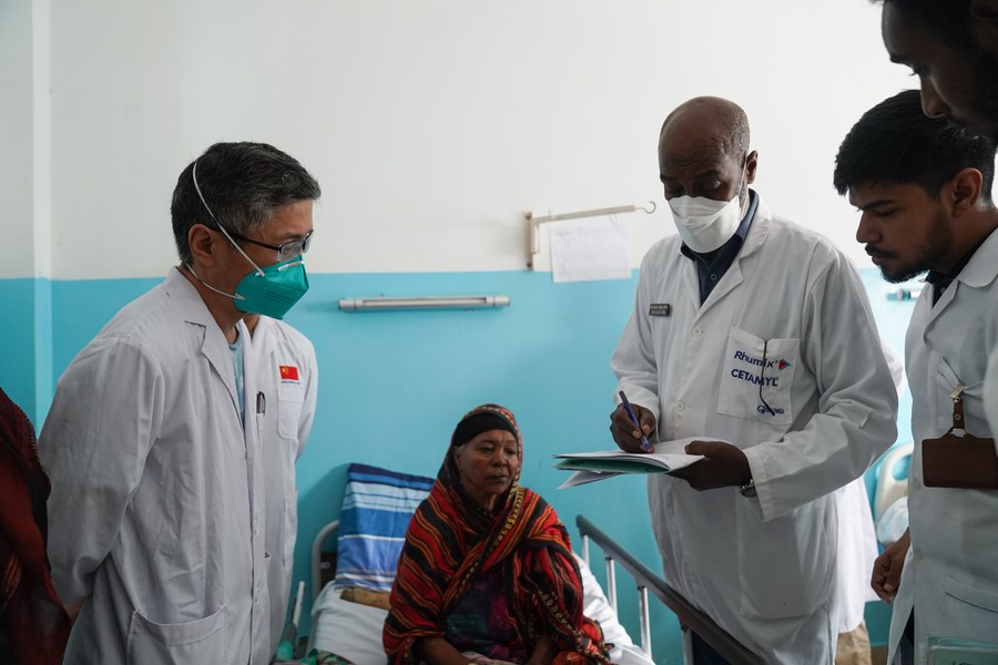 Hou Wei (L), a member of the 21st Chinese medical team dispatched to Djibouti, checks the conditions of patients with local doctors at the Peltier General Hospital in Djibouti City, Djibouti, March 1, 2023. (Xinhua/Han Xu)