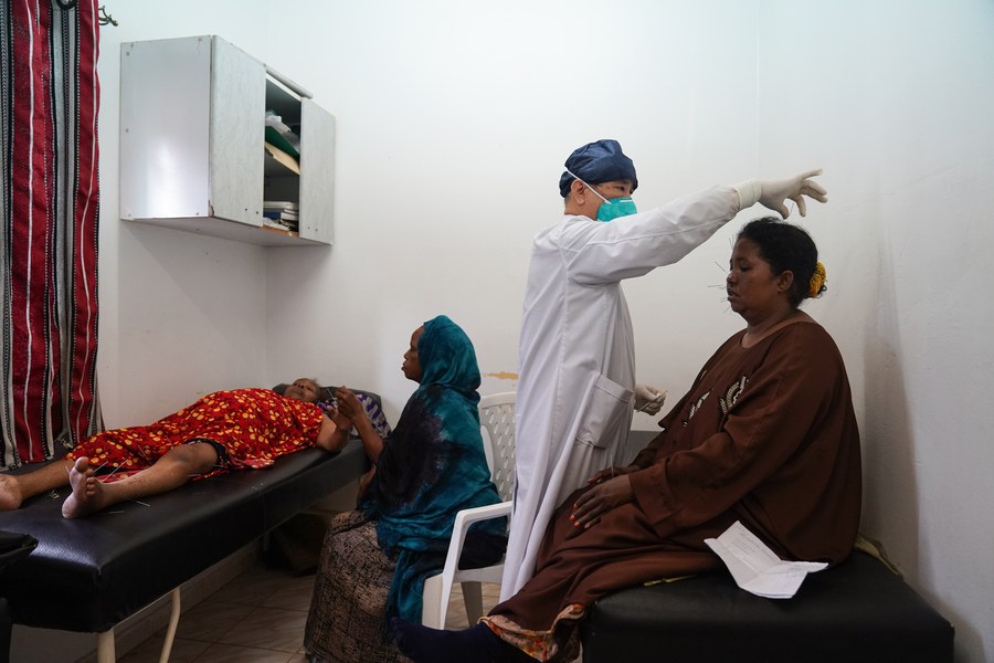 Zhou Naizhong, a member of the 21st Chinese medical team dispatched to Djibouti, provides acupuncture treatments for patients at the Peltier General Hospital in Djibouti City, Djibouti, Feb. 28, 2023. (Xinhua/Han Xu)