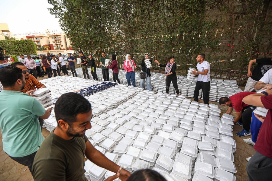 Volunteers pack iftar meals outside of the Al-Rahman charity kitchen in Cairo, Egypt, on April 9, 2023. Dozens of volunteers of different ages were busy cooking, packing and preparing meal boxes as their charity kitchen distributes thousands of free meals every day across the capital Cairo during the Muslim holy month of Ramadan. (Xinhua/Ahmed Gomaa)