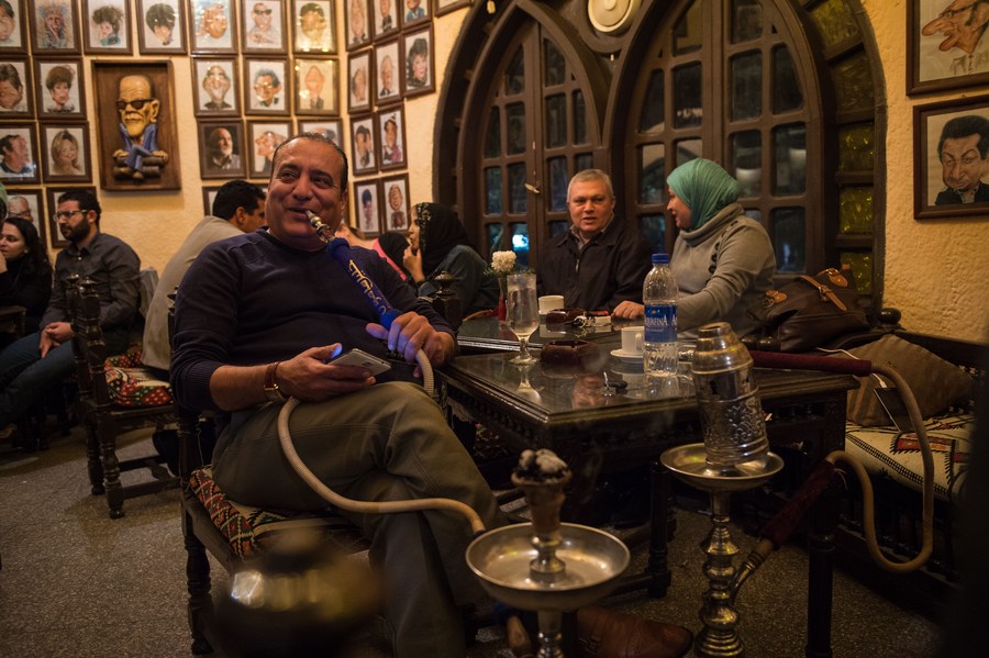 A man smokes shisha at Harafeesh Cafe in Giza, Egypt, March 3, 2016. (Xinhua/Meng Tao)