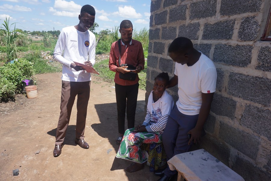 Photo taken on April 6, 2023, shows members of Youth Changing The Mindset Organization visiting a program beneficiary (2nd R) in Ndola, Copperbelt Province, Zambia. (Photo by Lillian Banda/Xinhua)