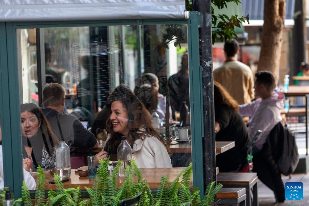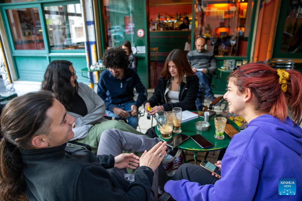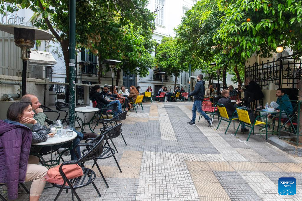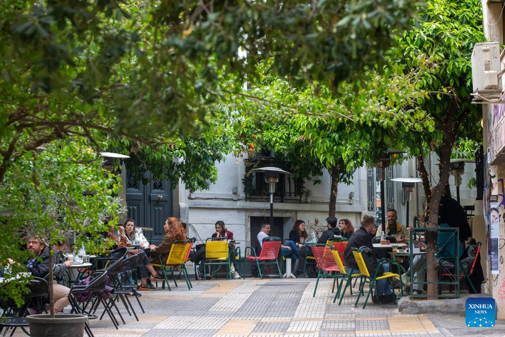 People spend time at a local cafe in downtown Athens, Greece, on April 11, 2023. Meeting over a cup of coffee has long been an integral part of Greek culture. However, the inflationary pressure of the past year has forced 54 percent of coffee lovers to cut back on their caffeine habit, a recent survey conducted for the Hellenic Coffee Association has found. (Xinhua/Marios Lolos)