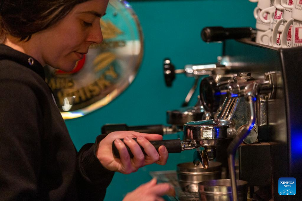 A barista prepares coffee at a local cafe in downtown Athens, Greece, on April 11, 2023. Meeting over a cup of coffee has long been an integral part of Greek culture. However, the inflationary pressure of the past year has forced 54 percent of coffee lovers to cut back on their caffeine habit, a recent survey conducted for the Hellenic Coffee Association has found. (Xinhua/Marios Lolos)