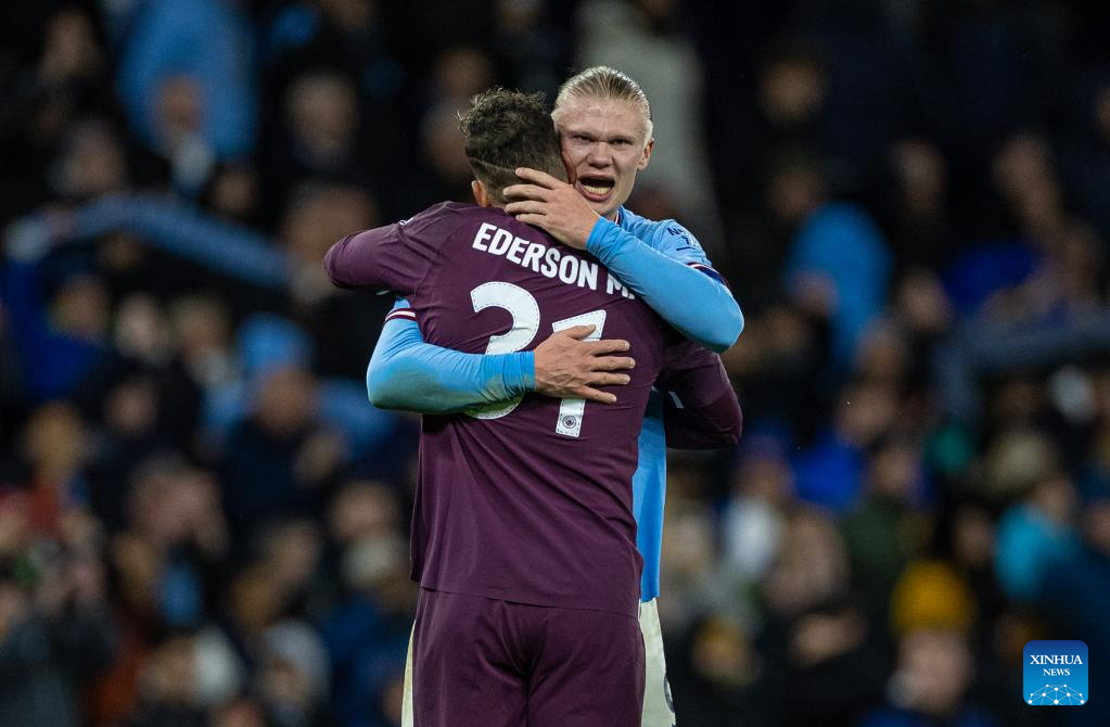 Manchester City's Erling Haaland (R) celebrates with teammate goalkeeper Ederson after the UEFA Champions League quarterfinal first Leg match between Manchester City and Bayern Munich in Manchester, Britain, on April 11, 2023. (Xinhua)