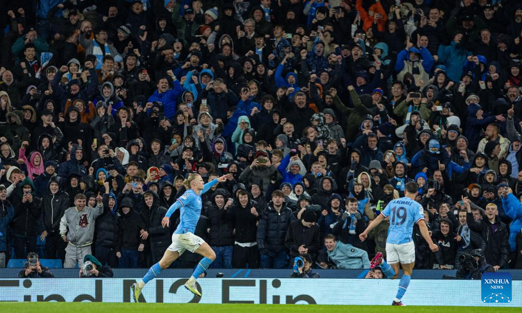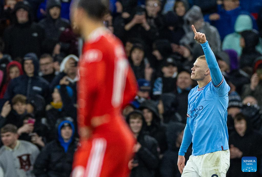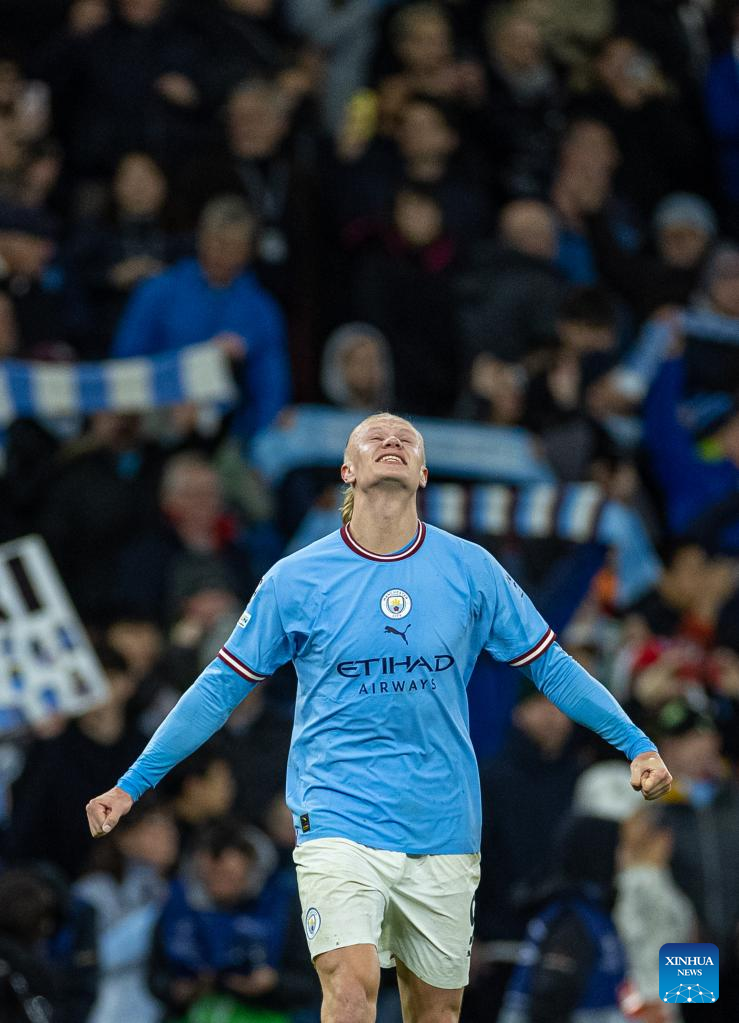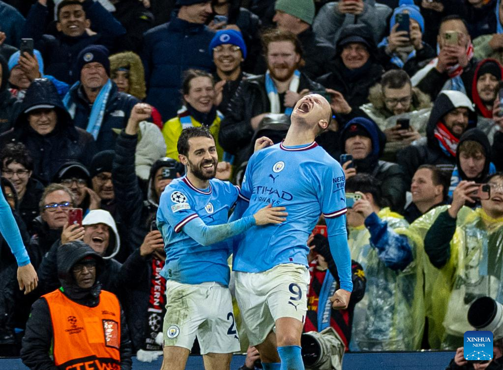 Manchester City's Erling Haaland celebrates after the UEFA Champions League quarterfinal first Leg match between Manchester City and Bayern Munich in Manchester, Britain, on April 11, 2023. (Xinhua)