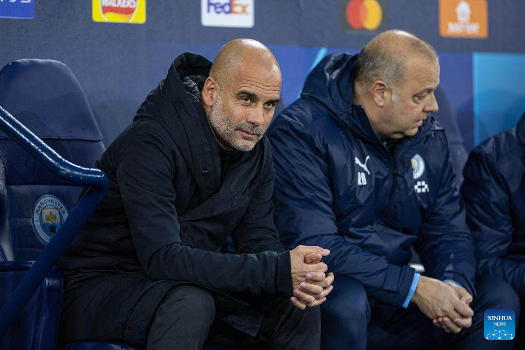 Manchester City's head coach Pep Guardiola (L) reacts before the UEFA Champions League quarterfinal first Leg match between Manchester City and Bayern Munich in Manchester, Britain, on April 11, 2023. (Xinhua)