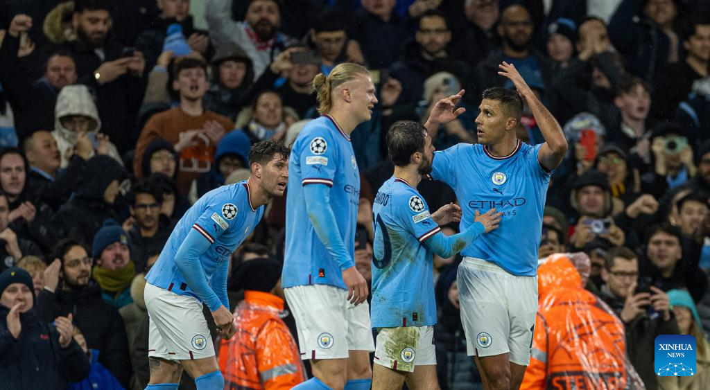 Manchester City's Rodri (2nd R) scores the opening goal during the UEFA Champions League quarterfinal first Leg match between Manchester City and Bayern Munich in Manchester, Britain, on April 11, 2023. (Xinhua)