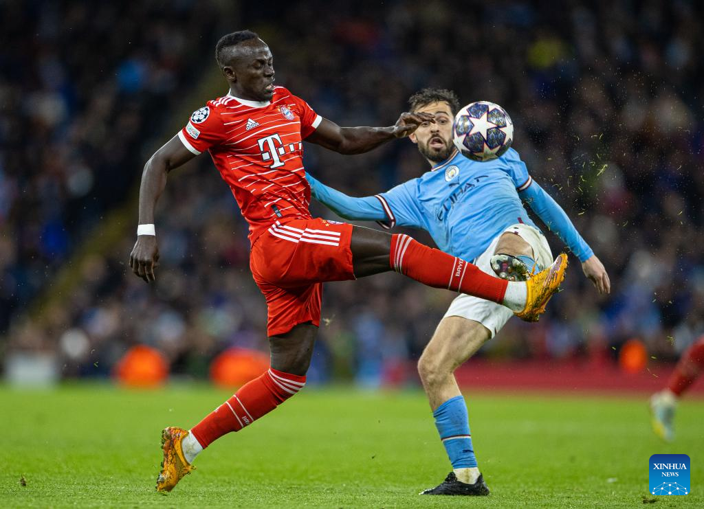 Bayern Munich's Sadio Mane (L) is challenged by Manchester City's Bernardo Silva during the UEFA Champions League quarterfinal first Leg match between Manchester City and Bayern Munich in Manchester, Britain, on April 11, 2023. (Xinhua)