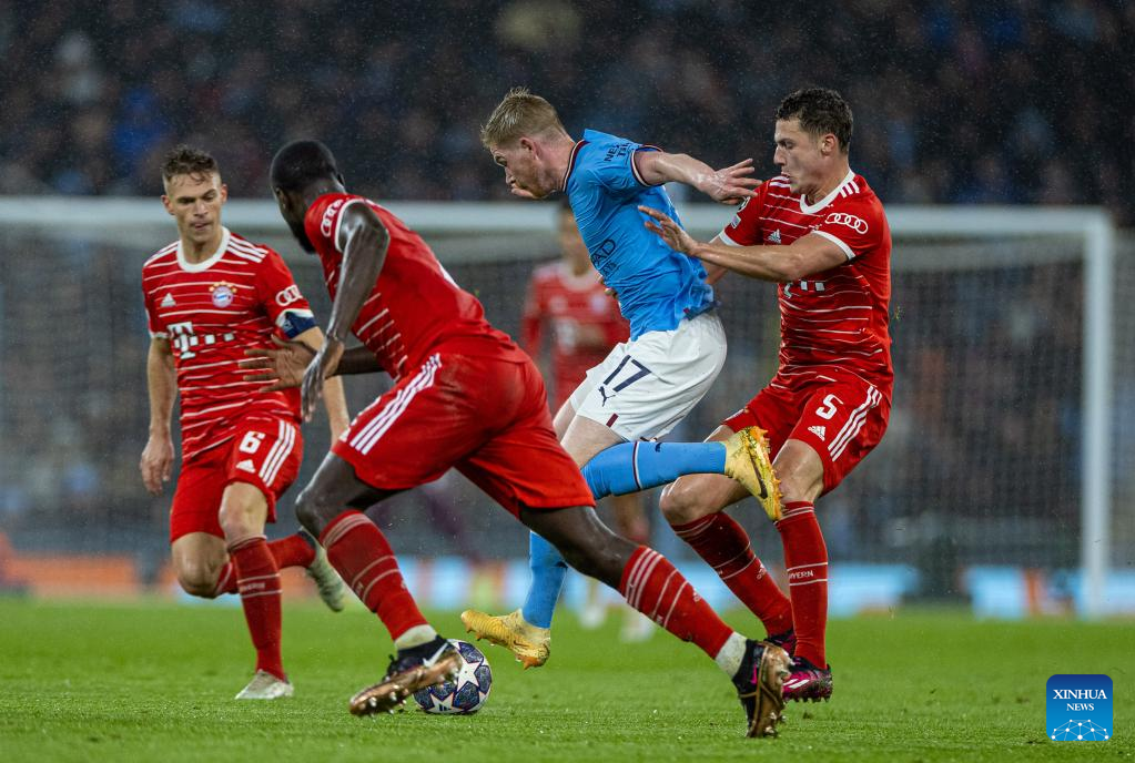 Manchester City's Kevin De Bruyne (2nd R) is challenged by Bayern Munich's players during the UEFA Champions League quarterfinal first Leg match between Manchester City and Bayern Munich in Manchester, Britain, on April 11, 2023. (Xinhua)