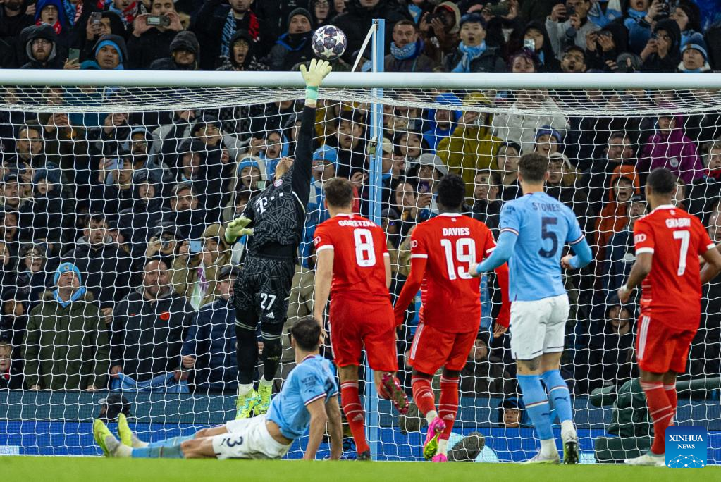 Bayern Munich's goalkeeper Yann Sommer (L, top) makes a save during the UEFA Champions League quarterfinal first Leg match between Manchester City and Bayern Munich in Manchester, Britain, on April 11, 2023. (Xinhua)