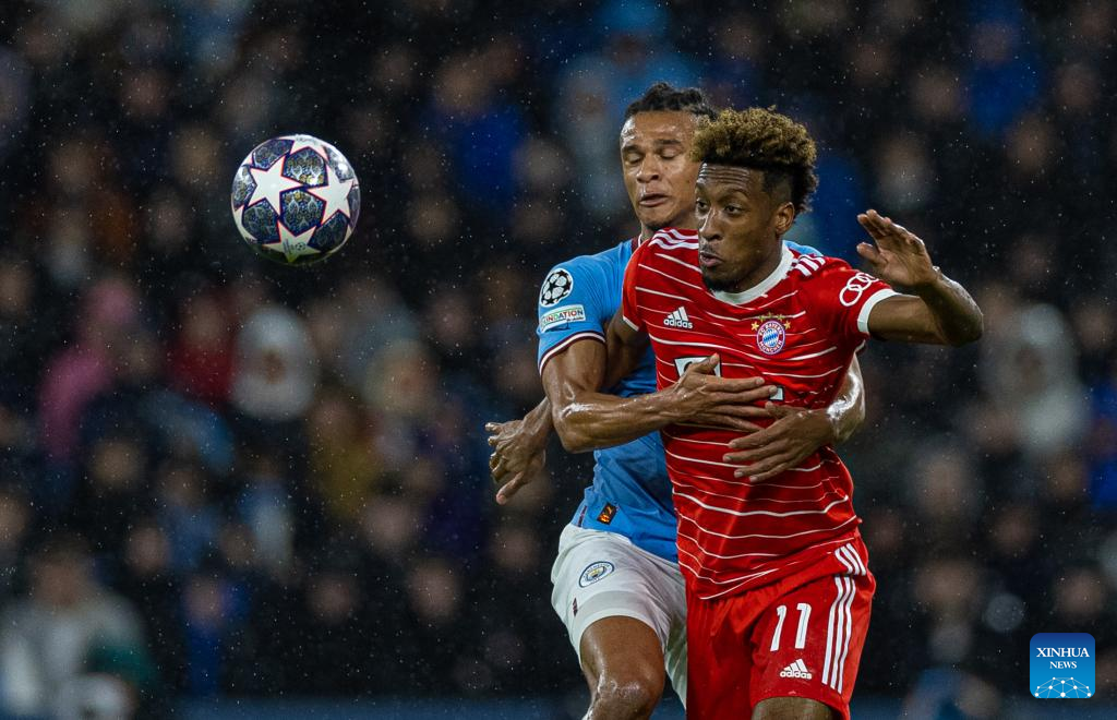 Bayern Munich's Kingsley Coman (R) is challenged by Manchester City's Nathan Ake during the UEFA Champions League quarterfinal first Leg match between Manchester City and Bayern Munich in Manchester, Britain, on April 11, 2023. (Xinhua)