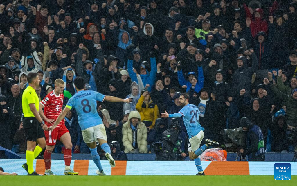 Manchester City's Bernardo Silva (1st R) celebrates after scoring a goal during the UEFA Champions League quarterfinal first Leg match between Manchester City and Bayern Munich in Manchester, Britain, on April 11, 2023. (Xinhua)