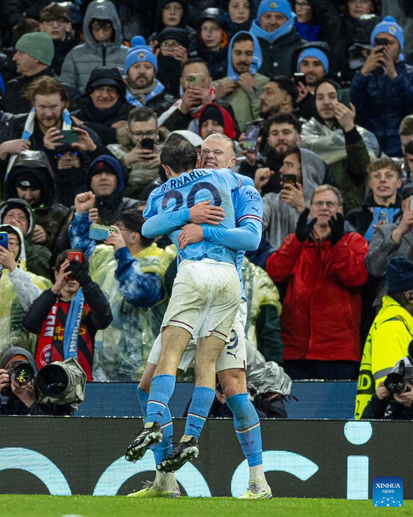 Manchester City's Erling Haaland (R) celebrates with teammate Bernardo Silva after scoring a goal during the UEFA Champions League quarterfinal first Leg match between Manchester City and Bayern Munich in Manchester, Britain, on April 11, 2023. (Xinhua)