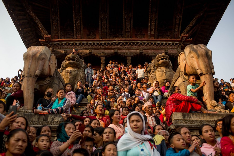 People gather together during the first day of the Bisket Jatra Festival at Bhaktapur Durbar Square in Bhaktapur, Nepal on April 10, 2023. (Xinhua/Sulav Shrestha)■