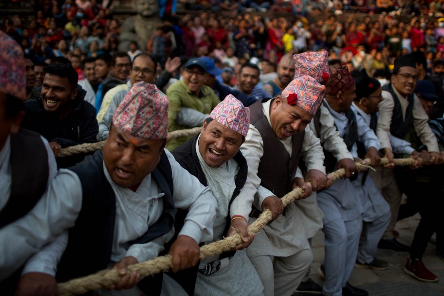 People pull the chariot of Lord Bhairav during the first day of the Bisket Jatra Festival at Bhaktapur Durbar Square in Bhaktapur, Nepal on April 10, 2023. (Xinhua/Sulav Shrestha)
