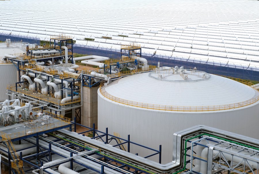This photo taken on April 9, 2023 shows the 100-megawatt solar thermal power plant generating electricity in Urad Middle Banner, north China's Inner Mongolia Autonomous Region. (Xinhua/Li Yunping)