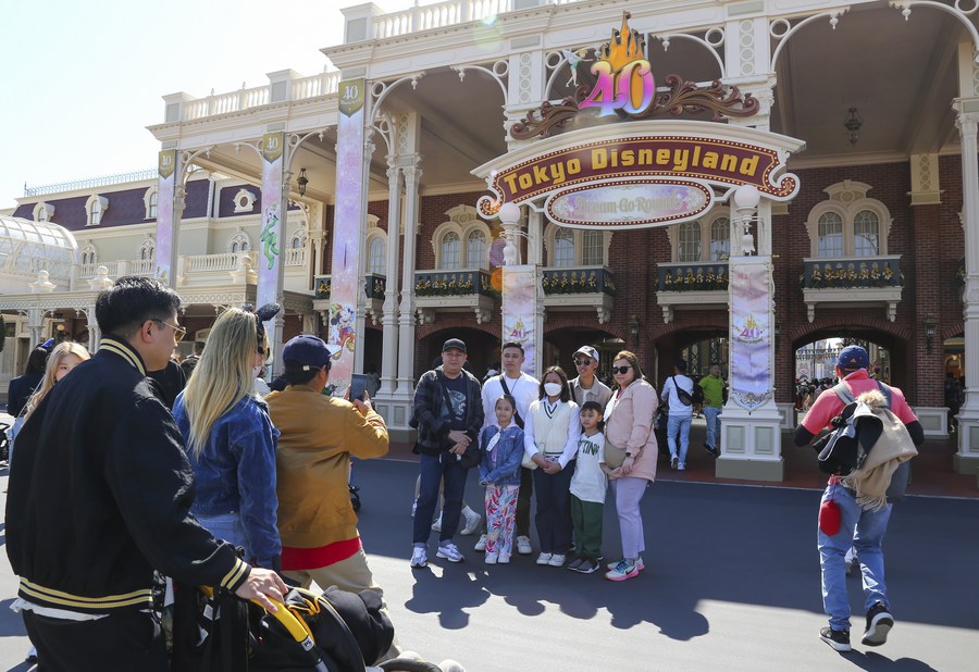 Visitors pose for photos at Tokyo Disneyland in Chiba Prefecture, Japan, April 10, 2023. (Xinhua/Qian Zheng)