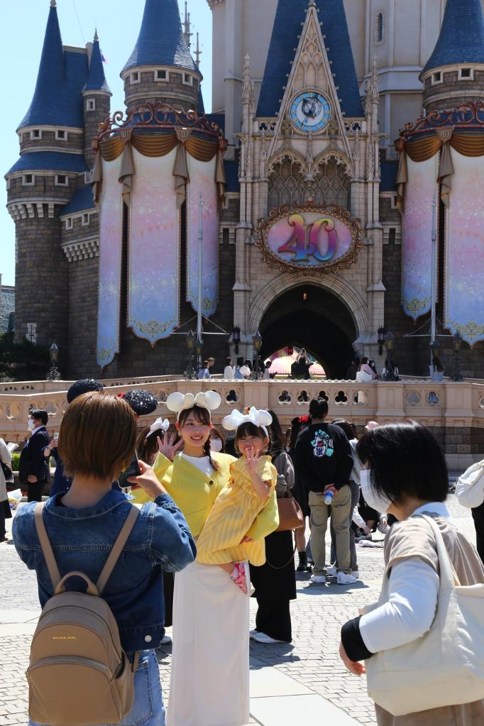 Visitors pose for photos at Tokyo Disneyland in Chiba Prefecture, Japan, April 10, 2023. (Xinhua/Qian Zheng)■