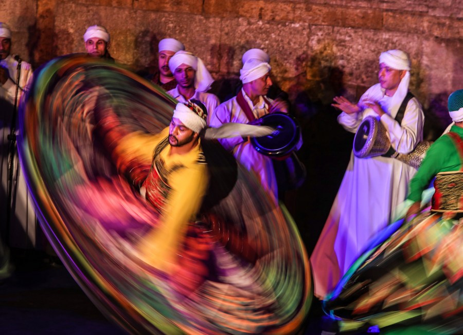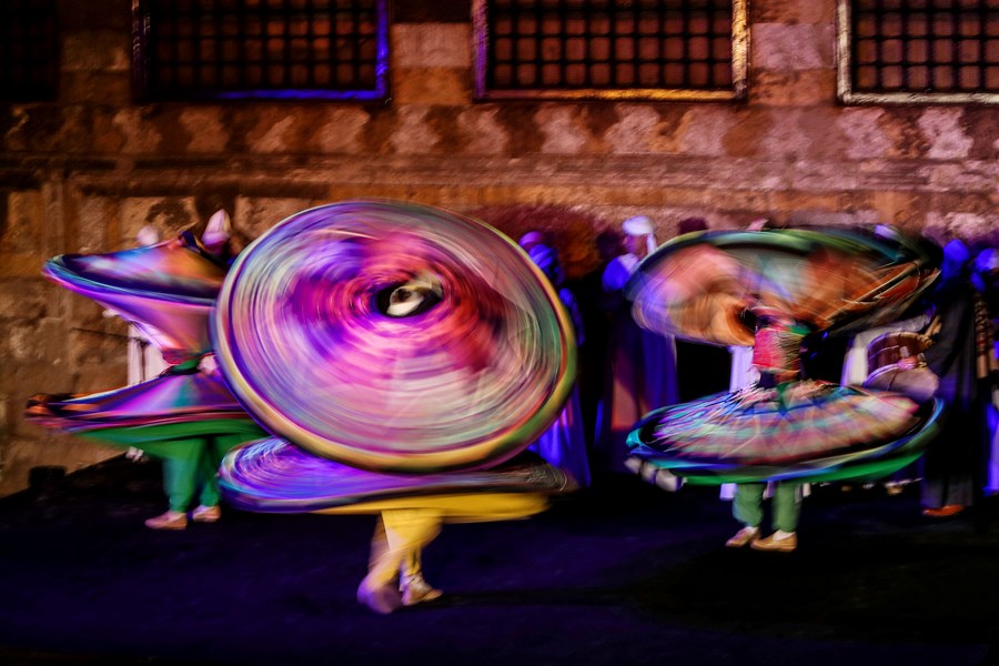 Dancers perform Tanoura, a traditional Egyptian folk dance, during the holy month of Ramadan at the Sultan Al-Ghuri complex in Cairo, Egypt, on April 12, 2023. (Xinhua/Ahmed Gomaa)