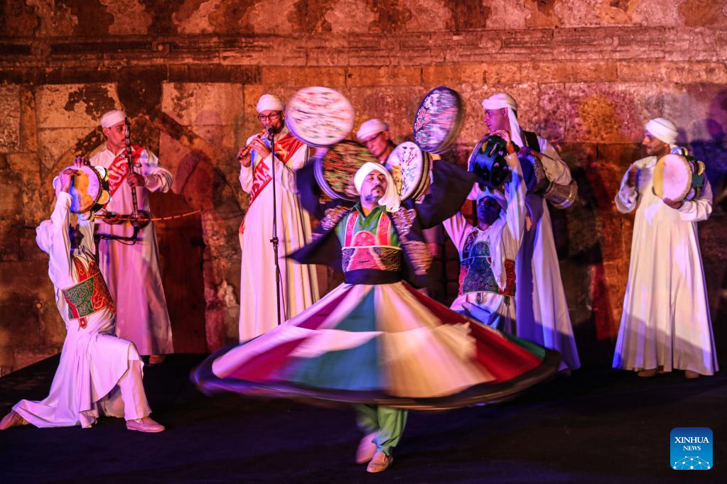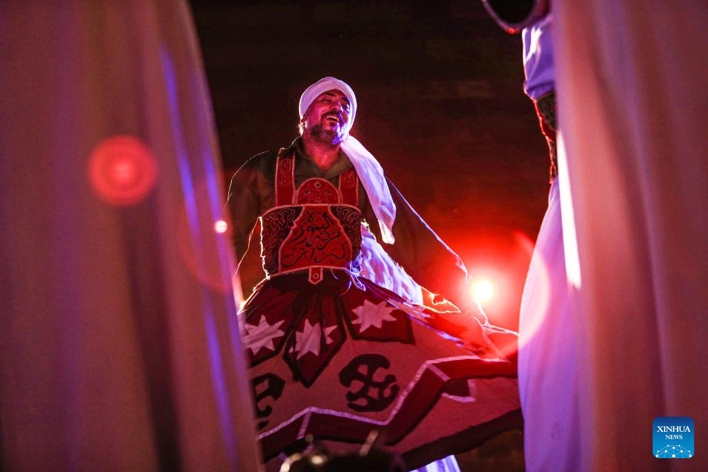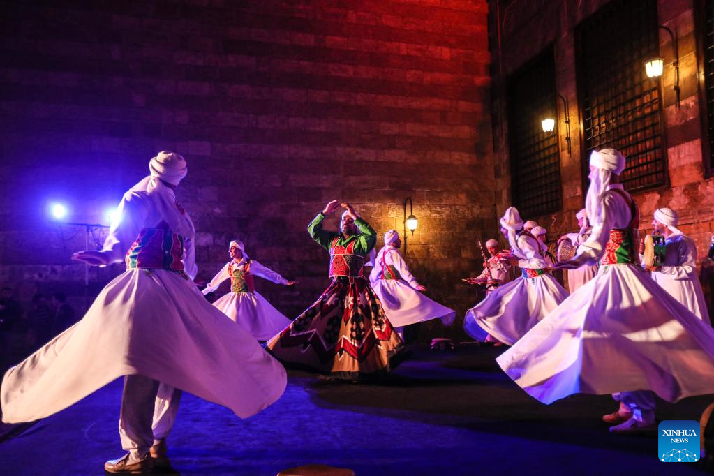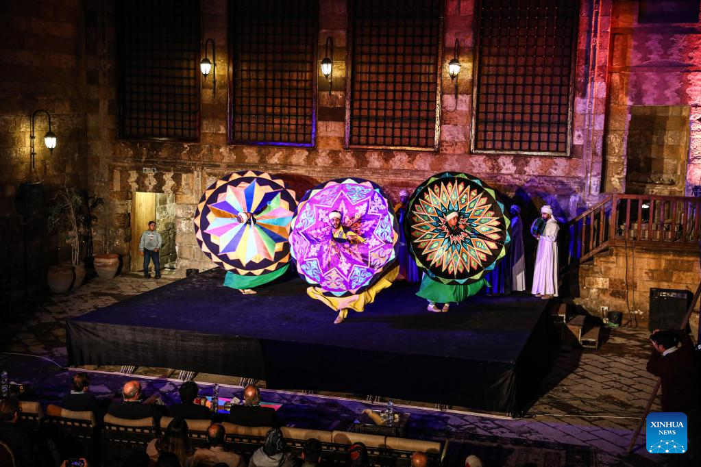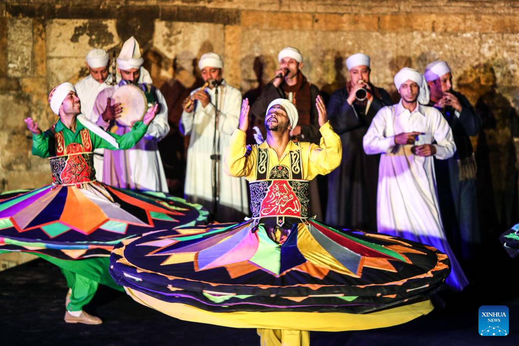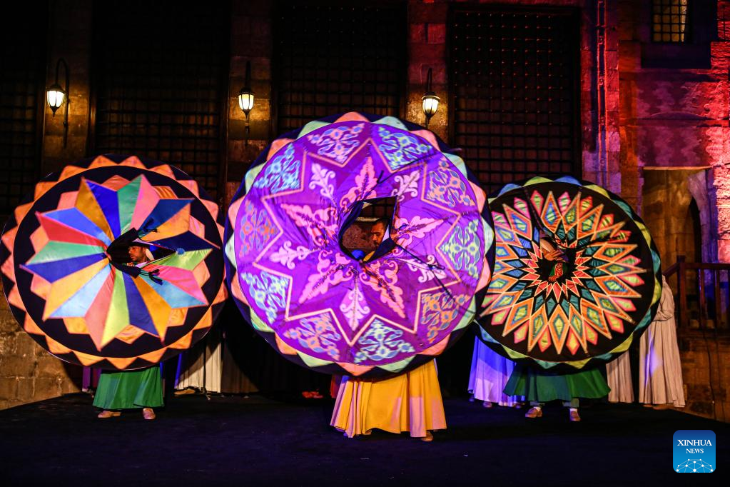 Dancers perform Tanoura, a traditional Egyptian folk dance, during the holy month of Ramadan at the Sultan Al-Ghuri complex in Cairo, Egypt, on April 12, 2023. Tanoura is an Arabic word, which means skirt in English. Tanoura dance is a traditional folk dance in Egypt, where the dancer in colorful skirts spins to the tunes of songs. (Xinhua/Ahmed Gomaa)