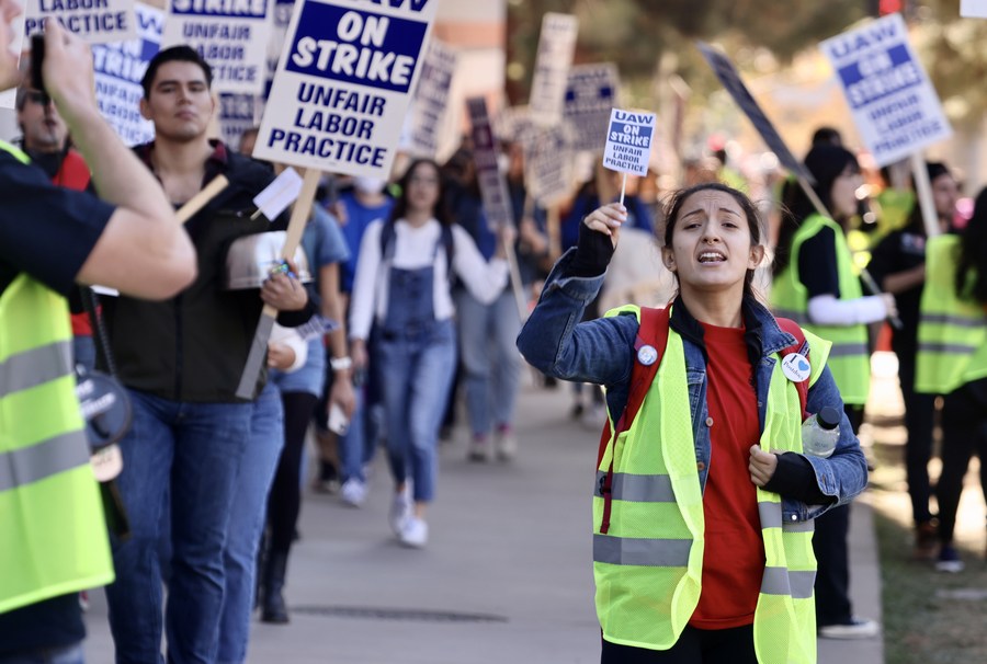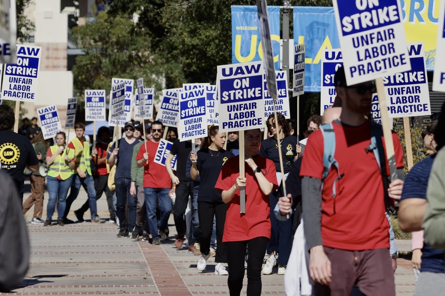 People take part in a protest on campus of the University of California, Los Angeles (UCLA) in Los Angeles, California, the United States, on Nov. 14. 2022. Tens of thousands of academic workers at the University of California (UC) system went on strike Monday for higher wages and better working conditions. (Xinhua)