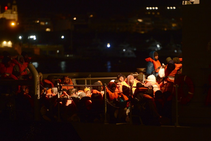 Migrants wait to disembark in Floriana, Malta, on Jan. 29, 2020. (Photo by Jonathan Borg/Xinhua)