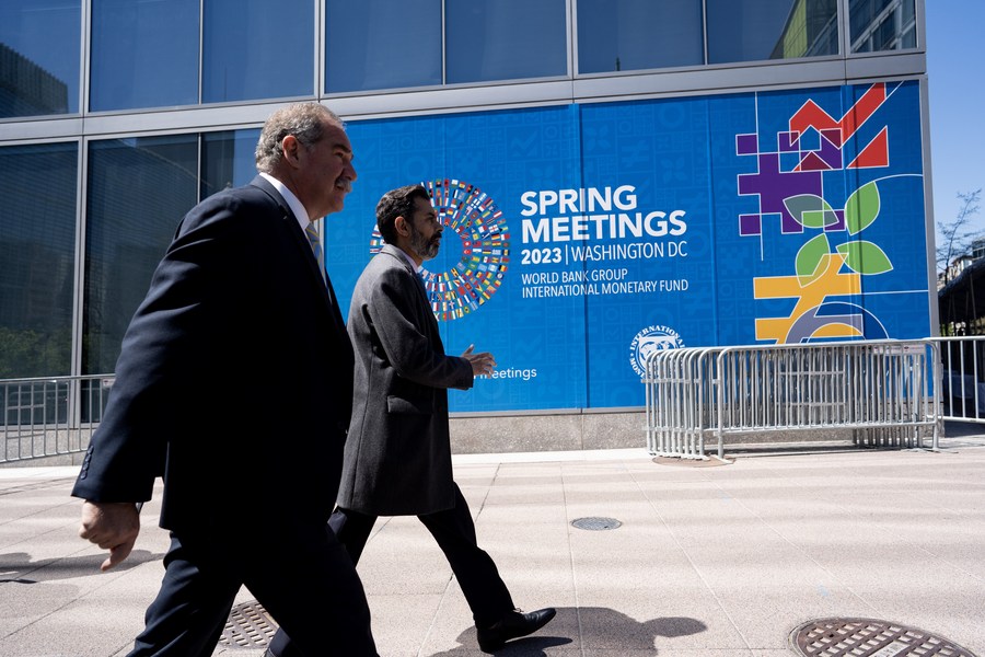 Pedestrians walk past the International Monetary Fund headquarters in Washington, D.C., the United States, April 10, 2023. (Xinhua/Liu Jie)